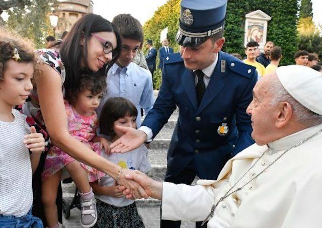 Všetci, pokračuje pápež, „sme hriešnici, ale chceme ísť vpred, a preto musíme bojovať proti diablovi, ktorý chce vstúpiť do nášho života“. Svätý Otec pripomenul, že v tomto duchovnom zápase nám pomáha Archanjel Michal, a vyzval žandárov: „Musíme byť opatrní a strážiť vinicu: vinicu každého z vás, vinicu vašich rodín, vašich detí a vinicu tu, vo Vatikáne, aby do nej nevstúpili zlé výhonky.“