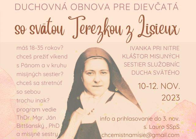 Nitra 11. októbra (TK KBS) V Kláštore Misijných sestier v Ivanke pri Nitre bude v dňoch 10. - 12. novembra 2023 Duchovná obnova pre dievčatá so svätou Terezkou z Lisieux. Povedú ju kňaz Ján Bittšanský s misijnými sestrami. Prihlásiť sa treba do 3. novembra na adrese: chcemistnamisie@gmail.com, informovala sr. Pavla Peštová SSpS.