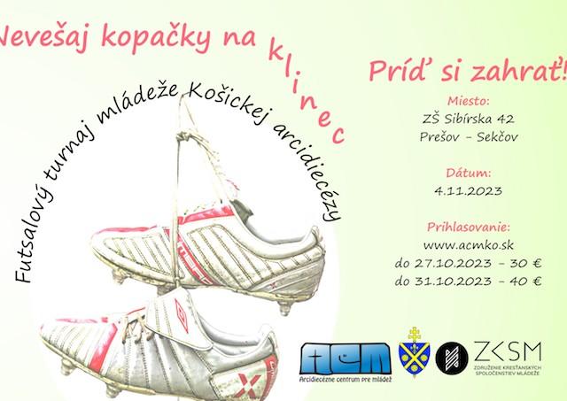 Košice 10. októbra (TK KBS) Arcidiecézne centrum pre mládež (ACM) v Košiciach organizuje v sobotu 4. novembra Futsalový turnaj mládeže Košickej arcidiecézy v telocvični na ZŠ Sibírska 42 v Prešove-Sekčove. Podmienky a prihlasovanie jednotlivých mužstiev sú dostupné na www.acmko.sk alebo na Facebooku ACM.