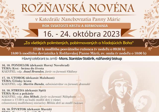 Rožňava 12. októbra (TK KBS) V Rožňavskej diecéze sa v dňoch 16. – 24. októbra 2023 bude konať už po tretíkrát Rožňavská novéna. Prvýkrát bola v roku 2021. Rožňavský biskup Mons. Stanislav Stolárik pozýva na novénu všetkých, ktorí sa jej chcú zúčastniť v centre diania – v rožňavskej katedrále, ale aj tých, ktorí sa chcú pridať prostredníctvom online vysielania cez odkazy na www.burv.sk a sledovania priamych prenosov Rožňavskej novény cez Rádio Lumen (každý deň) a TV LUX v nedeľu 22. októbra od 10:00 do 11:30.