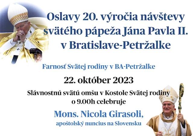 Bratislava 16. oktĺbra (TK KBS) Farnosť Svätej rodiny v Bratislave-Petržalke pozýva na oslavy 20. výročia návštevy svätého pápeža Jána Pavla II. v Bratislave-Petržalke, ktoré vyvrcholia slávnostnou svätou omšou v nedeľu 22. októbra 2023 o 9:00 v Kostole Svätej rodiny, ktorú bude celebrovať apoštolský nuncius na Slovensku Mons. Nicola Girasoli.