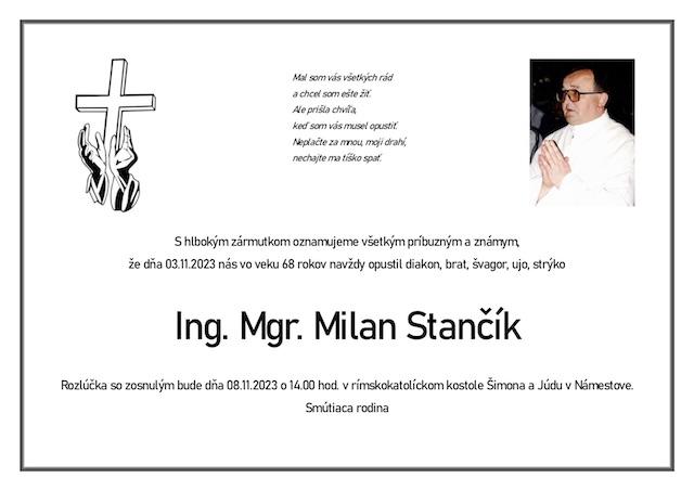 Bratislava 6. novembra (TK KBS) V piatok 3. novembra 2023 zomrel v 68. roku života diakon Milan Stančík. Zádušná svätá omša s pohrebnými obradmi bude 8. novembra 2023 o 14:00 v Rímskokatolíckom kostole Šimona a Júdu v Námestove.