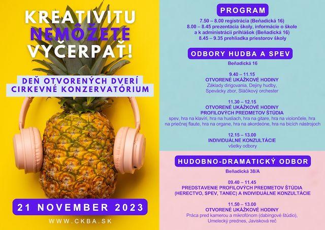 Bratislava 14. novembra (TK KBS) Cirkevné konzervatórium v Bratislave pozýva všetkých záujemcov o štúdium v odboroch hudba, spev a hudobno-dramatické umenie, na deň otvorených dverí, ktorý sa uskutoční 21. novembra 2022 od 8:00. Na stretnutí s vedením školy a pedagógmi sa záujemci dozvedia všetky informácie o škole, štúdiu v jednotlivých odboroch a o prijímacích skúškach.
