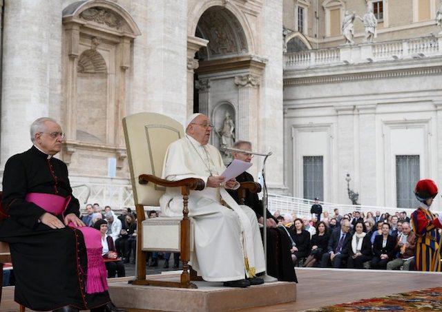 „Modlime sa, bratia a sestry, za mier, osobitne za sužovanú Ukrajinu, ktorá tak veľmi trpí, a potom za ľudí vo Svätej zemi, v Palestíne a Izraeli. Nezabúdajme ani na Sudán, ktorý tak veľmi trpí. A myslime na všetky ďalšie miesta, kde prebiehajú vojny. Je toľko vojen! Modlime sa za pokoj: každý deň nech si niekto nájde čas na modlitbu za pokoj. Chceme mier. Všetkým žehnám!“