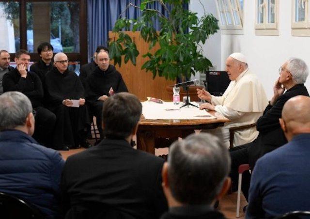Štyridsiatich kňazov XVII. prefektúry pápežovi predstavil pomocný biskup Riccardo Lamba. V kaplnke pred svätostánkom strávil pápež niekoľko minút v tichej modlitbe sediac na invalidnom vozíku. V sále farnosti sa venoval jeden a pol hodinovému dialógu s kňazmi, ktorí mu kládli otázky zamerané na pastoračné témy, ako sú práca, sviatosti, chudoba, pohostinnosť, pomoc sociálne slabším skupinám či evanjelizácia.