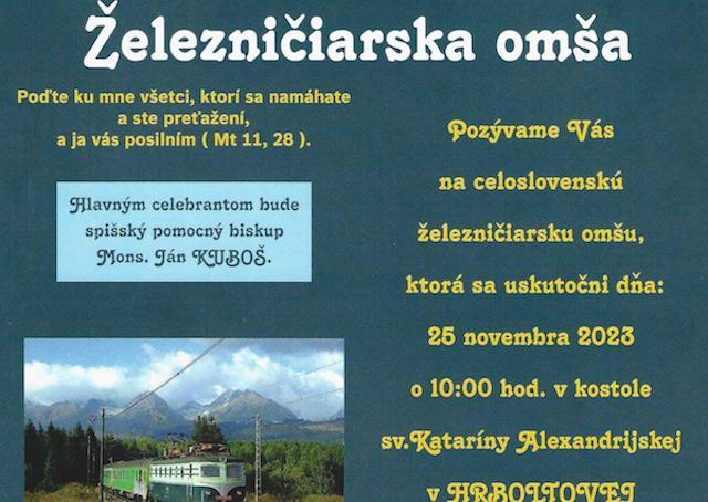 Hrboltová 20. novembra (TK KBS) V sobotu 25. novembra 2023 o 10:00 bude v kostole sv. Kataríny Alexandrijskej v Hrboltovej celoslovenská ,železničiarska‘ svätá omša. Hlavným celebrantom bude spišský pomocný biskup Mons. Ján Kuboš. Organizátorom je rušňovodič a člen Dozornej rady ZSSK CARGO a.s. Jozef Róbert Šmigalla z Prešova.