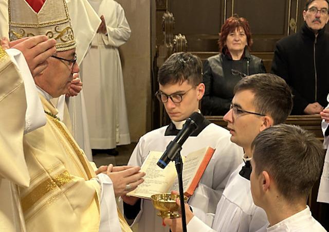Spišská Kapitula 30. novembra (TK KBS) Na slávnosť Krista Kráľa počas svätej omše v katedrálnom chráme sv. Martina z Tours v Spišskej Kapitule prijali seminaristi 4. ročníka ministérium akolytátu, ktorý im udelil spišský pomocný biskup Mons. Ján Kuboš. Za akolytov boli ustanovení Gregor Baláž (Stará Ľubovňa), Peter Kalafut (Rudňany) a Jakub Pakos (Brezovica).