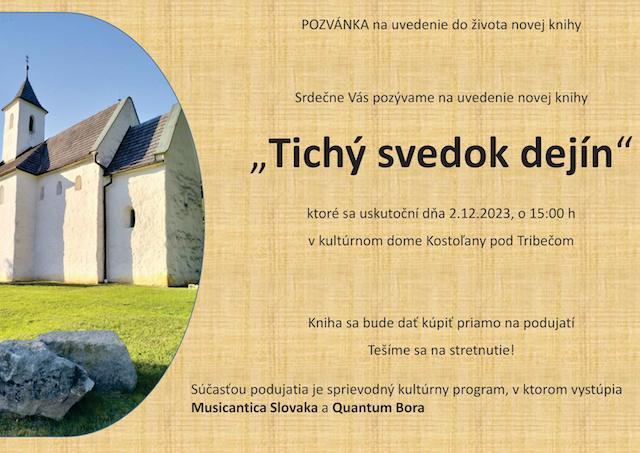 Kostoľany pod Tribečom 30. novembra (TK KBS) Obecný úrad Kostoľany pod Tribečom a Farnosť Ladice pozývajú na uvedenie do života novej knihy Tichý svedok dejín, ktoré bude v sobotu 2. decembra 2023 o 15:00 v Kultúrnom dome v Kostoľanoch pod Tribečom. Súčasťou podujatia je sprievodný kultúrny program, v ktorom vystúpia Musicantica Slovaka a Quantum Bora. Kniha sa bude dať zakúpiť priamo na podujatí aj s podpisom autora.