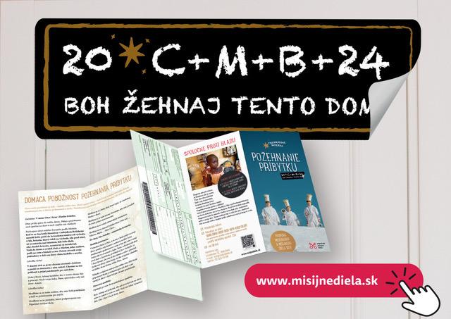 Materiál na požehnania domu si môžete objednať TU , uvádzajú PMD, ktoré pošlú nálepku na dvere s nápisom 20 * C + M + B + 24 (dobre odnímateľná) a modlitbu požehnania príbytku spolu s informáciou o možnostiach podpory misií.