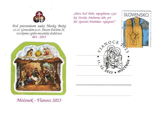 Močenok 11. decembra (TK KBS) Klub filatelistov 52 – 46 Močenok spolu s Farnosťou sv. Klimenta Močenok vydal príležitostnú poštovú pečiatku a lístok Vianoce 2023, ktoré budú od 11. do 19. decembra 2023 na pošte v Močenku, informoval Jozef Kútny z Klubu filatelistov 52 – 46 Močenok.