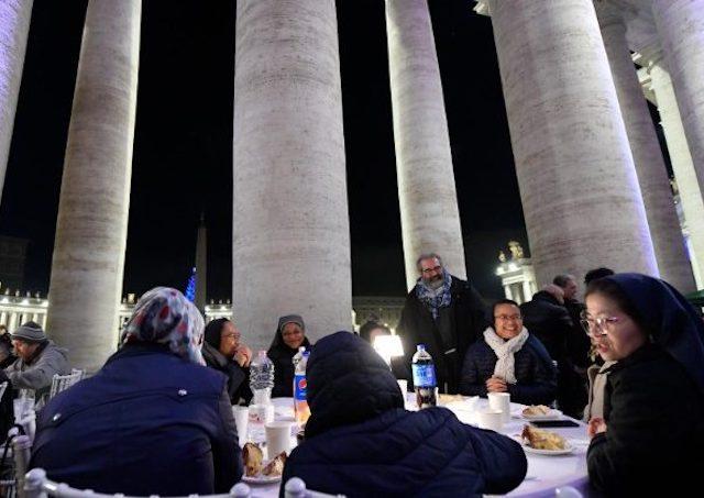 „Chudobní, tuláci a žobráci dostali možnosť pracovať a pápežský plat a pod vedením najlepších majstrov postavili túto kolonádu,“ spomína kardinál Krajewski. Dodáva, že časom bol nad kolonádou postavený baldachýn, aby sa pútnici a chudobní mohli ukrývať v jeho tieni a tiež tam prenocovať. Teraz pod Berniniho kolonádou sedávali Ježišovi vyvolení – chudobní – na špeciálnej večeri. „Pozvali sme ich, aby sme im vrátili dôstojnosť a aby sme boli spolu s nimi práve v takejto veľmi významnej chvíli, keď žiara vianočného stromčeka osvetlí celú kolonádu postavenú koniec-koncov aj vďaka bezdomovcom, chudobným a žobrákom. Bol to krásny večer. Krásne prestreté stoly s horiacimi svetielkami, biele obrusy, biele stoličky,“ hovorí pápežský almužník.