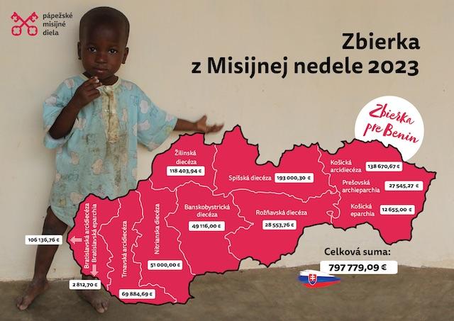 Bratislava 15. decembra (TK KBS) Vo všetkých kostoloch na Slovensku v 1527 farnostiach sa počas Misijnej nedele 22. októbra 2023 vyzbieralo 797 779,09 eur na podporu misijných diel pápeža Františka. Informovali o tom Pápežské misijné diela na Slovensku.