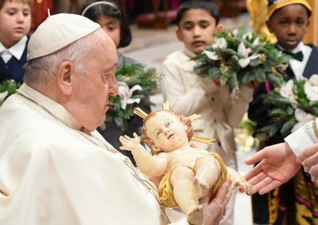 Bratia a sestry, toto je úžas Vianoc: nie zmes nasladlých citov a svetskej útechy, ale nevídaná neha Boha, ktorý zachraňuje svet tým, že sa vtelil. Pozrime sa na dieťa, pozrime sa na jeho maštaľ, pozrime sa na jasličky, ktoré anjeli nazývajú „znamením“ (Lk 2, 12): v skutočnosti je to znamenie odhaľujúce tvár Boha, ktorý je súcit a milosrdenstvo, všemohúci vždy a len v láske. Stáva sa blízkym, nežným a súcitným, toto je Boží spôsob, blízkosť, súcit a nežnosť.
