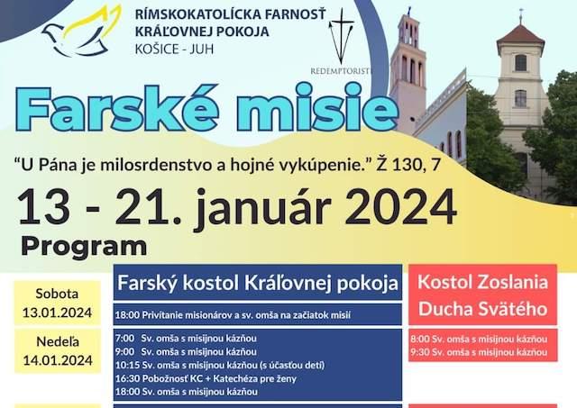 Košice 9. januára (TK KBS) V dňoch 13. až 21. januára 2024 sa vo farnosti Kráľovnej pokoja Košice–Juh uskutočnia farské misie pod vedením pátrov redemptoristov. Misie povedie misijný tím P. Michala Zamkovského.
