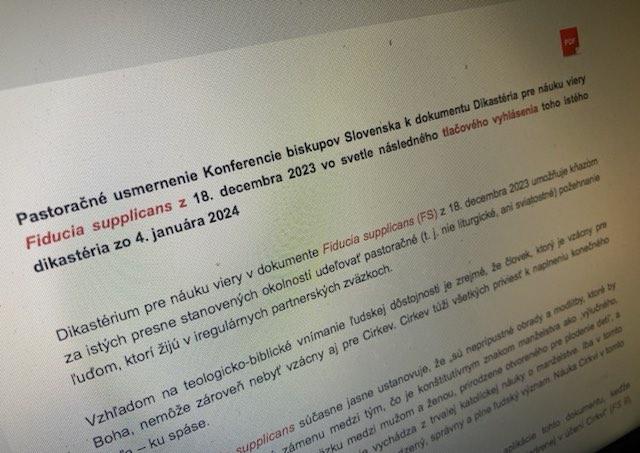 Dikastérium pre náuku viery vo vyhlásení Fiducia supplicans (FS) z 18. decembra 2023 umožňuje kňazom za istých presne stanovených okolností udeľovať pastoračné (t. j. nie liturgické, ani sviatostné) požehnanie ľuďom, ktorí žijú v iregulárnych partnerských zväzkoch, píšu v úvode pastoračného usmernenia biskupi Slovenska. „Aby sa teda predišlo akýmkoľvek nedorozumeniam v prípade aplikácie tohto dokumentu, keďže ,požehnanie vyžaduje, aby to čo sa požehnáva, zodpovedalo Božej vôli vyjadrenej v účení Cirkvi‘ (FS 9), vydávame nasledujúce pastoračné usmernenie,“ uvádzajú.