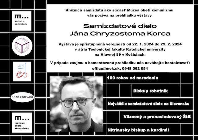 Košice 17. januára (TK KBS) Knižnica samizdatu ako súčasť Múzea obetí komunizmu v Košiciach pripravila pri príležitosti 100. výročia narodenia kardinála Jána Chryzostoma Korca v dňoch od 20. januára do 29. februára 2024 v átriu Teologickej fakulty v Košiciach na Hlavnej ulici 89 výstavu s názvom Samizdatové dielo J. Ch. Korca.
