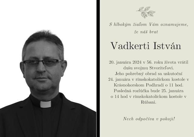 Rožňava 21. januára (TK KBS) V 57. roku života a 33. roku kňazstva zomrel v sobotu kňaz Rožňavskej diecézy István Vadkerti, súdny vikár, čestný kanonik a farár farnosti Krásnohorské Podhradie.