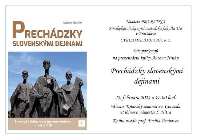 Nitra 20. februára (TK KBS) Nadácia PRO PATRIA, Rímskokatolícka cyrilometodská fakulta UK v Bratislave a CYRILOMETODIADA, o. z. pozývajú na prezentáciu knihy Antona Hrnku Prechádzky slovenskými dejinami.