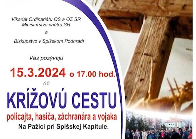 Spišská Kapitula 15. marca (TK KBS) Vikariát Ordinariátu Ozbrojených síl a ozbrojených zborov SR a Spišské biskupstvo pozývajú dnes o 17:00 na krížovú cestu policajta, hasiča, záchranára a vojaka. Uskutočni sa na Pažici pri Spišskej Kapitule. Pobožnosť povedie spišský biskup Mons. František Trstenský. Po krížovej ceste bude svätá omša v Katedrále sv. Martina.