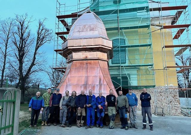 Práce začali 14. júla 2023, keď s pomocou žeriavu zložili pôvodnú konštrukciu veže na zem, kde šikovní majstri vytvorili jej vernú kópiu. Použili pri tom rovnaké materiály ako na pôvodnej veži, ako aj staré poctivé techniky obrábania dreva i pokrývania plechom, za čo majstrom patrí veľký obdiv i vďačnosť. Ako krytina bol použitý medený plech, ktorý ochráni toto dielo po mnohé desiatky rokov. Po dokončení výroby bola helmica umiestnená opäť na svoje pôvodné miesto a následne bol do jej vrcholu vsadený nerezový kríž. Oplechovaná konštrukcia s krížom je vysoká 10 metrov a váži zhruba 6 ton. Pod jej vrchol bude po požehnaní nitrianskym biskupom Mons. Viliamom Judákom umiestnená časová schránka, ako pamiatka pre budúce generácie.