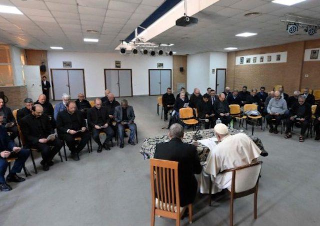 Vo farnosti privítali pápeža v piatok. Privítal ho pomocný biskup Daniele Salera a farár Massimiliano Memma, ktorý už dvanásť rokov vedie komunitu približne 10 000 veriacich. S 35 kňazmi a diakonmi prefektúry strávil pápež František približne hodinu a pol. Stretnutie sa začalo modlitbou a vzývaním Ducha Svätého, pápež odpovedal na otázky týkajúce sa rôznych tém, najmä pastoračných.