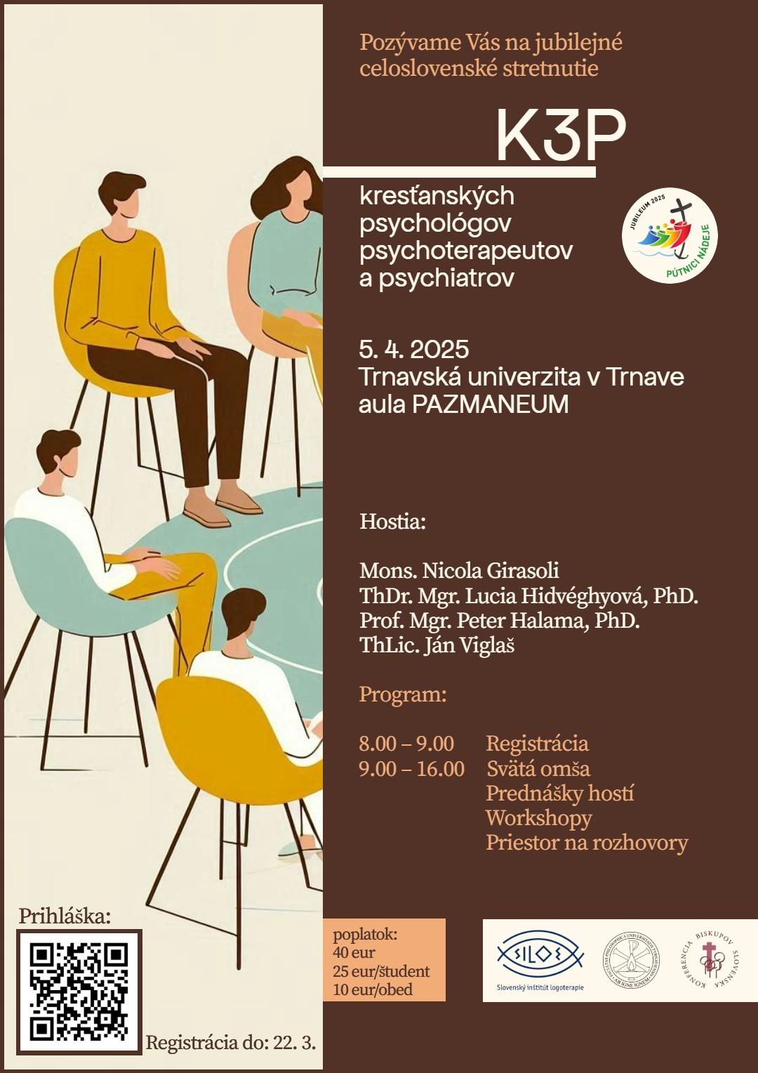 Bratislava 26. februára (TK KBS) Už po piaty raz sa na Slovensku uskutoční Celoslovenské stretnutie kresťanských psychológov, psychoterapeutov a psychiatrov (K3P) pod záštitou Konferencie biskupov Slovenska. Hlavným garantom podujatia je Mons. Marek Forgáč – košický pomocný biskup.