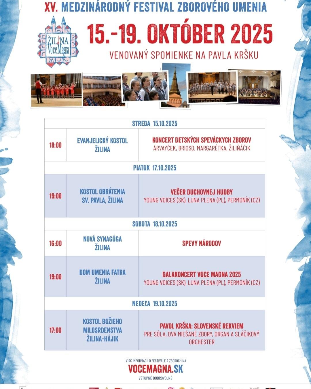 Žilina 16. októbra (TK KBS) V dňoch 15. – 19. októbra 2025 sa v Žiline koná jubilejný XV. ročník Medzinárodného festivalu zborového umenia Žilina Voce Magna 2025. Festival je venovaný spomienke na významného slovenského dirigenta a zborového pedagóga Pavla Kršku.
