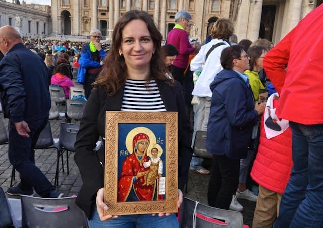 Na samotnú audienciu sa spolu s manželom – gréckokatolíckym kňazom – prihlásili v rámci oficiálnej registrácie pútnikov. Ikonu, ktorú doma váhala zabaliť, nakoniec zobrali so sebou. „Naše očakávanie bolo jednoduché – chceli sme, aby ju Svätý Otec požehnal. A ak sa podarí, radi by sme mu ju darovali. Keď išiel okolo, môj manžel volal ,For Papa!’ pracovníci z pápežovho sprievodu si ju všimli a vzali,“ spomína ikonopiskyňa. Aj keď Svätému Otcovi ikonu neodovzdali priamo do rúk, videli, že sa za ňou obzrel. „Bol to neskutočný mix emócií – radosť, vďačnosť a úžas, že sa to vôbec podarilo,“ dodala.