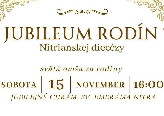 Nitra 30. novembra (TK KBS) V rámci prebiehajúceho Jubilejného roka 2025 Nitrianske biskupstvo pozýva predovšetkým manželov s ich rodinami (deťmi, vnúčatami, pravnúčatami…) na slávenie Jubilea rodín Nitrianskej diecézy, ktoré sa bude konať v sobotu 15. novembra 2025 v Katedrále-Bazilike sv. Emeráma v Nitre, ktorá je aj jedným z jubilejných chrámov Nitrianskej diecézy a možno v nej získať jubilejné odpustky.