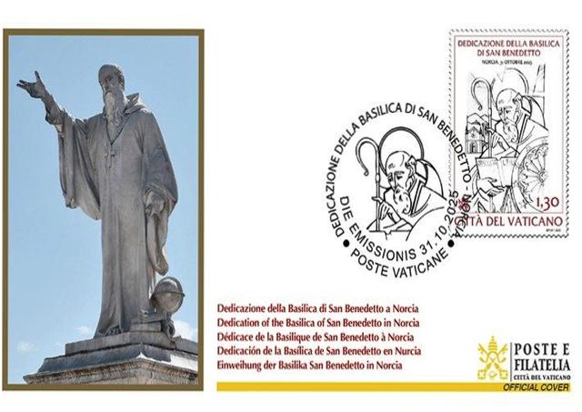 Nová vatikánska poštová známka s nominálnou hodnotou 1,30 eura zobrazuje postavu svätého Benedikta – „posla pokoja“ (Pacis Nuntius) – obklopenú architektonickými detailmi baziliky. Svätý drží vo svojich rukách Regulu, rozpoznateľnú podľa úvodných slov „Obsculta o fili“.