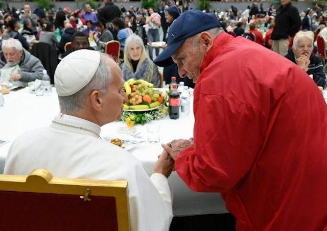 Vatikán 16. novembra (VaticanNews) V nedeľu 16. novembra v Aule Pavla VI. sa pripomienka Svetového dňa chudobných niesla v atmosfére radosti, pohostinnosti a spolupatričnosti. Išlo o obed s núdznymi, ktorý pripravila vincentínska komunita, na ktorom sa zúčastnilo 1300 hostí z rôznych krajín. Pápež prišiel po modlitbe Anjel Pána a osobne všetkých privítal.