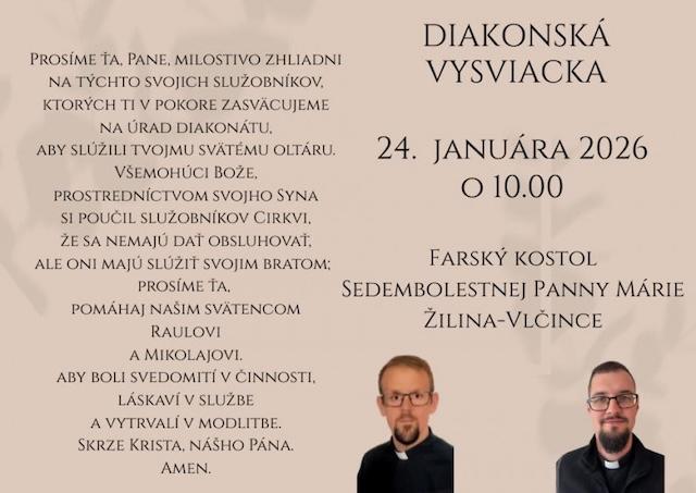 Žilina 20. januára (TK KBS) Vo farskom Kostole Sedembolestnej Panny Márie v Žiline-Vlčinciach prijmú v sobotu 24. januára 2026 o 10:00 sviatosť vysviacky v stupni diakonátu kandidáti Raul Pajić a Mikolaj Nawrot z Diecézneho misijného seminára Redemptoris Mater. Sviatosť vysviacky im udelí vkladaním rúk a ordinačnou modlitbou žilinský diecézny biskup Mons. Tomáš Galis.