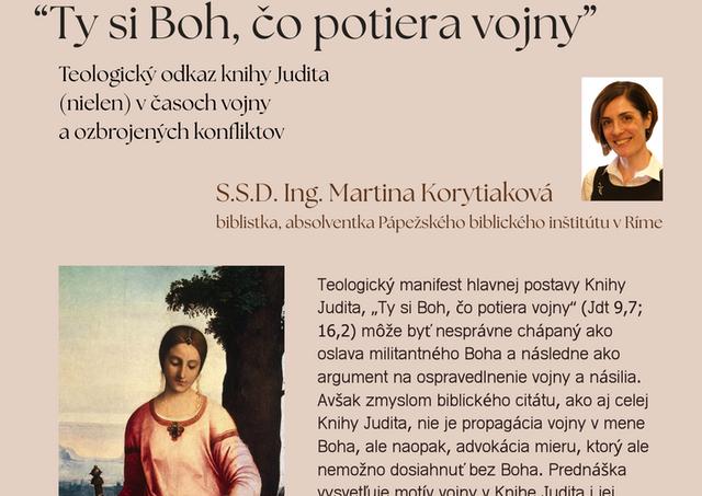 Prednáška podrobne vysvetlí motív vojny v biblickom kontexte a objasní, prečo sa chválospev hlavnej hrdinky stal pevnou súčasťou katolíckej liturgie hodín (Ranných chvál). Okrem teologickej roviny sa dotkne aj sakrálneho umenia, kde Judita vystupuje ako dôležitý predobraz Panny Márie. Cieľom stretnutia je pomôcť veriacim aj širokej verejnosti pochopiť, že zámerom týchto textov nie je vyvolávať strach, ale vlievať nádej, ktorá patrí k základnému pokladu viery.