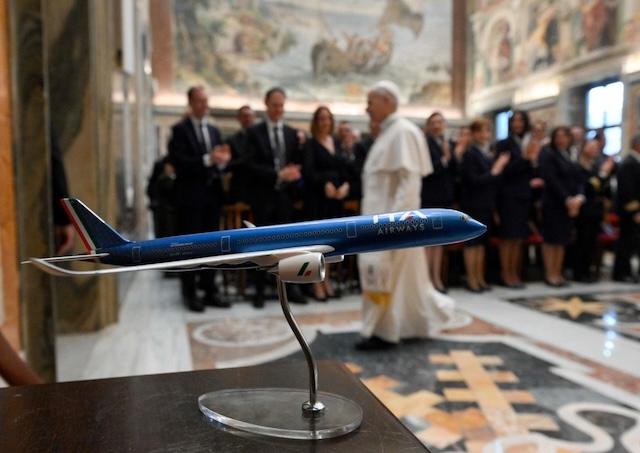 Svätý Otec pripomenul osobitnú úlohu talianskeho národného leteckého dopravcu pri apoštolských cestách pápežov od čias svätého Pavla VI. a vyjadril vďačnosť za službu, ktorú poskytujú pápežovi aj jeho sprievodu počas zahraničných ciest.